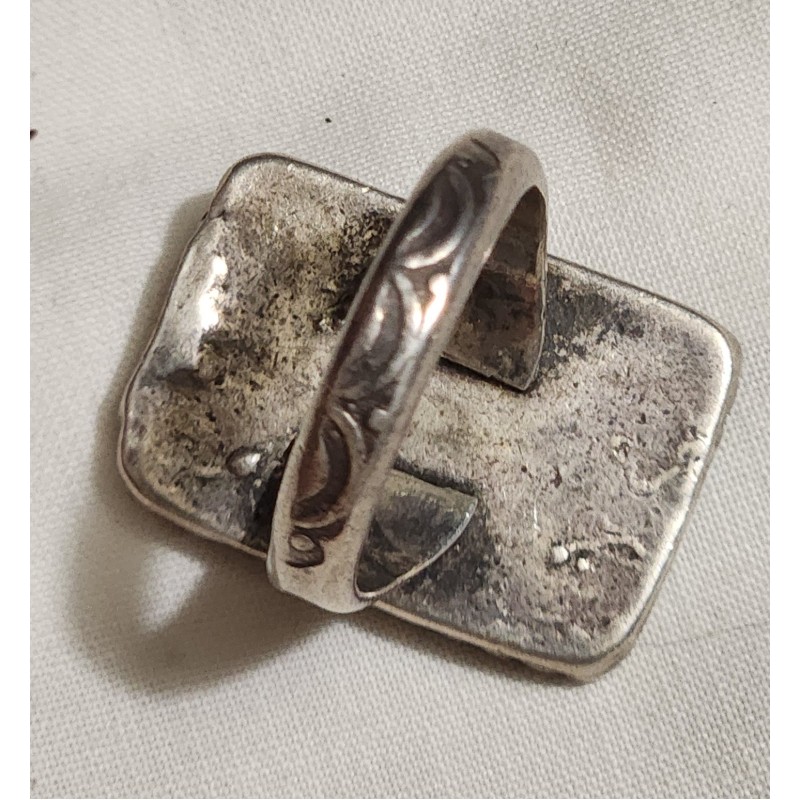 FABULOUS VINTAGE STERLING SILVER RING, WITH INLAY STONS, TURQUOISE,CORAL, AND WHITE MOTHER OF PEARL INLAY BEAUTIFULLYIN THE STERLING FLAT FRAME. WHICH IS 1 INCH TOP.